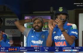 Rohit Sharma’s reaction to Harshit Rana’s six became viral on social media. When Harshit Rana hit a powerful six, Rohit Sharma looked surprised at first, and then he smiled and clapped. His reaction showed pride and encouragement for the young player.